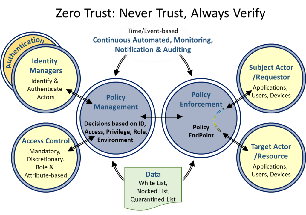This standard handles user, application and device identity, authentication, access control based on roles and attributes, policy enforcement at policy endpoints and continuous monitoring as shown in the Figure on the right. Its initial intention covers many use cases of potential Zero Trust-based services.