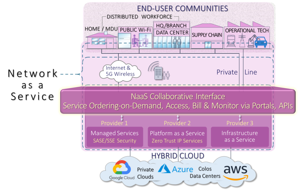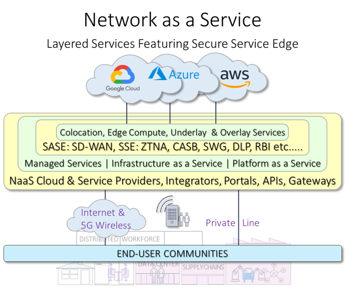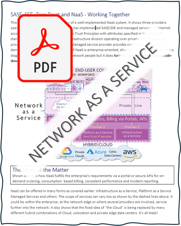 It shows three providers operating in different geographies. One has implemented SAS/SSE and managed services via Internet access. The second not. The third services a critical infrastructure division operating over private lines to a service provider running an IaaS network. The Managed service provider provides common API services on-demand via a portal or via APIs. Finally, if NaaS is enterprise-oriented, shouldn’t they be at the top of the diagram. It may look a little strange to network people but it does turn the world of networking upside-down!